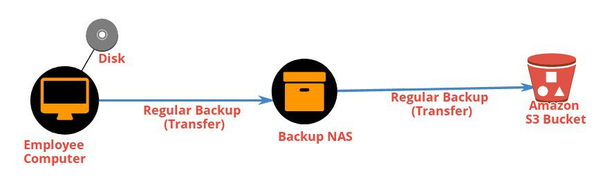 Here is an employee computer and from that computer, it is storing information on the disk. From time to time we perform a regular backup to NAS and it is a central device for saving data, from NAS we regular backup on AWS S3 Bucket.