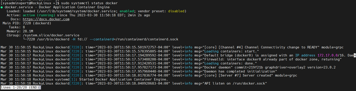 [sysadminxpert@RockyLinux ~]$ sudo systemctl start docker
